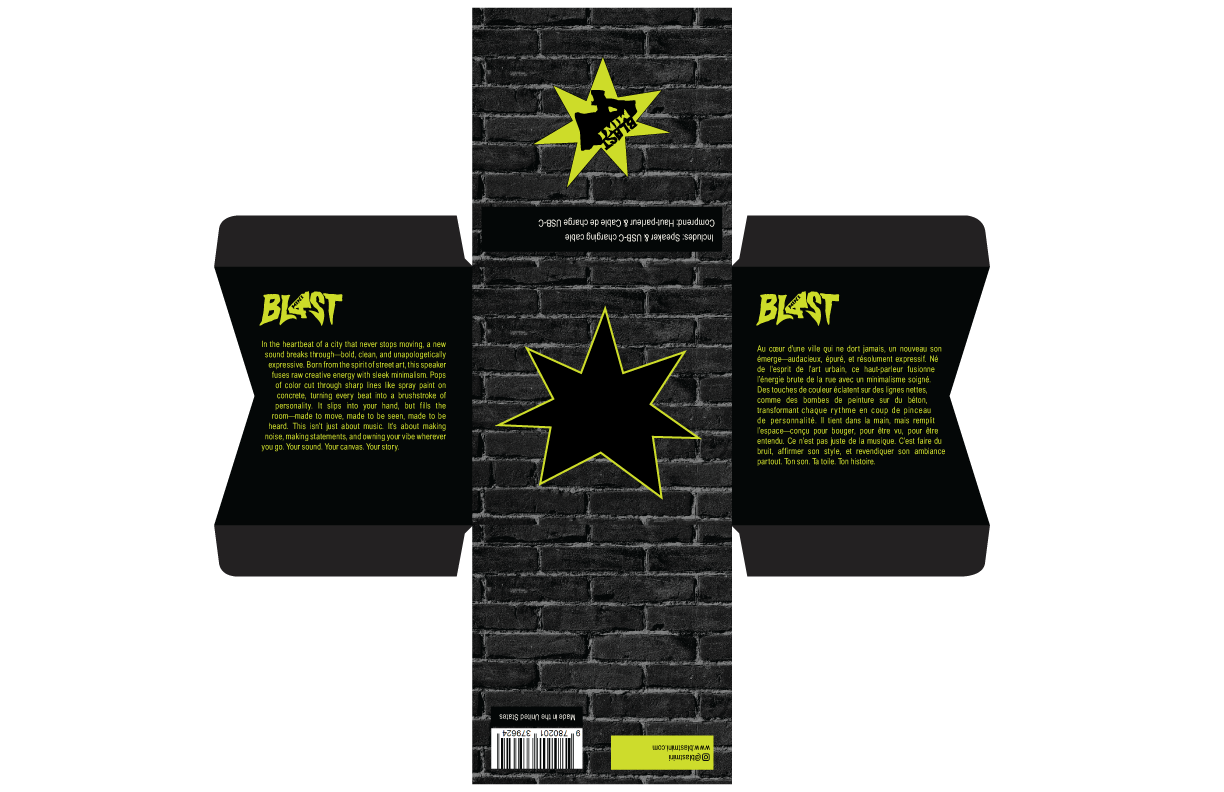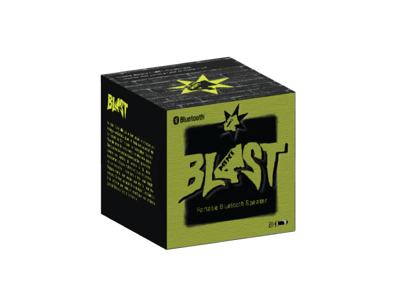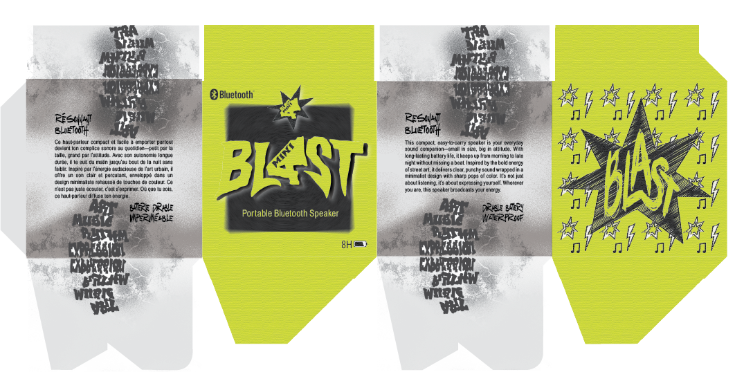 Our design is inspired by 1970s graffiti era and minimalism, two completely different styles. While the value is found inside inside the box with our Blast Mini speaker, we believe in the importance of a story and experience, which we included in the design of our packaging. We stuck with simple colors in order to portray the minimalism with a neon green that stands out. The main element of the outer box is the brick wall that's used to illustrate the speaker's sound breaking through it. The inner-box conveys the loudness in its design with the elements of graffiti and the neon green color. Hence, it all ties in with the expressing oneself with their own unique sound.